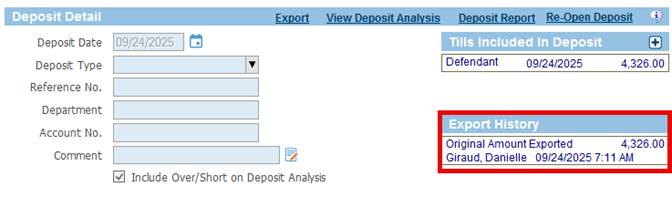 - Once you have properly exported your deposit, you will see the details in the Export History box.
